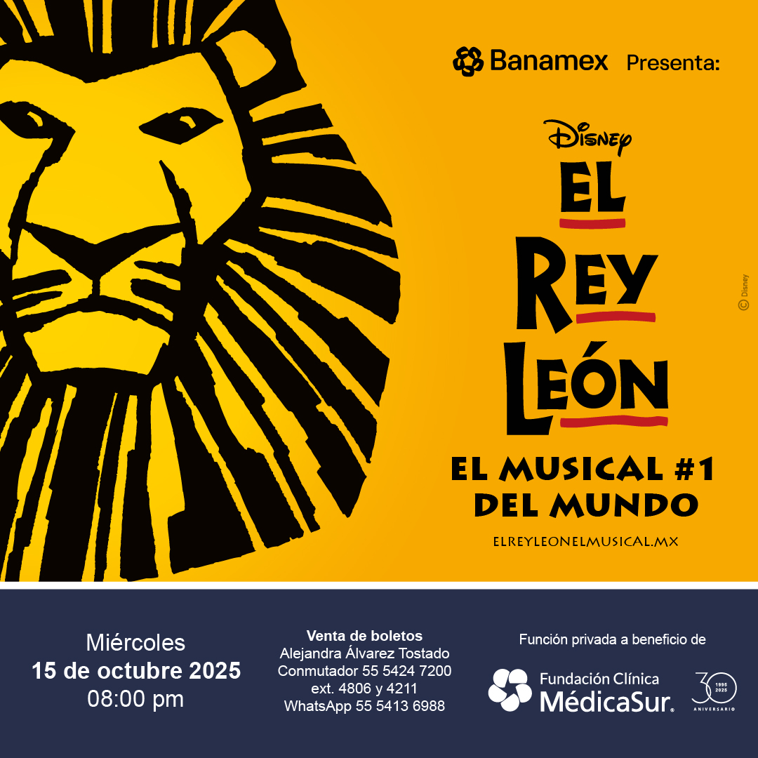 ¡Te invitamos a la función privada del musical "El Rey León" que tendremos en beneficio de la Fundación Clínica Médica Sur, el próximo miércoles 15 de octubre a las 8:00 pm en el teatro Telcel en Plaza Carso!